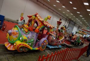 Παιδικό τρενάκι με χριστουγεννιάτικο διάκοσμο που κινείται σε σταθερή τροχιά.